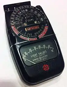 ![]() General Electric Light Meter used in photography to measure light values in foot-candles. | |