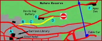 The path commences at the eastern boundary of the Upper Town at the junction of Devil's Gap Road with Baca's Passage. It proceeds in a mostly southerly direction before reaching a flight of steps which link it to Green Lane, the road leading to Devil's Gap Battery. Although it was previously overgrown and in a poor condition,[10] it was renovated in 2013 as part of the Upper Rock Management Plan to make it more accessible,[11] in a similar way to the refurbishment previously carried out at Mediterranean Steps.[12] As part of the refurbishment works, the path was widened by pruning overgrown trees and shrubs and the drains were unclogged to prevent the path from puddling after rains. Information display panels carrying historical information about the path and on the wildlife that can be found there, together with a picnic table and waste bins designed to keep out Gibraltar's Barbary macaques were also added along the path.[13] The Gibraltar Ornithological and Natural History Society and the Gibraltar Heritage Trust oversaw it to ensure the work was carried out in a sensitive manner.[11]