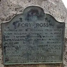 Fort Ross is a former Russian establishment on the west coast of North America in what is now Sonoma County, California. It was the hub of the southernmost Russian settlements in North America from 1812 to 1841. Notably, it was the first multi-ethnic community in northern California, with a combination of Native Californians, Native Alaskans, Russians, Finns and Swedes.[4] It has been the subject of archaeological investigation and is a California Historical Landmark, a National Historic Landmark, and on the National Register of Historic Places. It is part of California's Fort Ross State Historic Park.