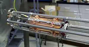 A cylindrical ICR cell. The walls of the cell are made of copper, and ions enter the cell from the right, transmitted by the octopole ion guides.