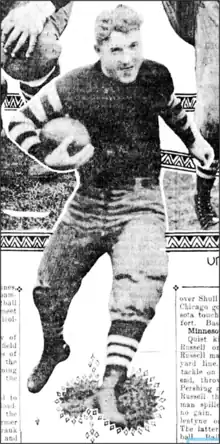 Chicken first played professional football for Bobby Marshall’s Hennepins in 1911 and then played fullback and halfback for the Minneapolis Marines in 1913 and again from 1915 to 1917. He played as a ringer for West Duluth in 1916 and for the Rock Island Independents in 1917. During World War I in 1918, Chicken played for the U.S. Army Air Service Mechanics School service team. After the war, he played for the Rock Island Independents in 1919 and 1920. Chicken played for the Minnesota All-Stars in 1921 and for the Ironwood Legion in 1922.[4]