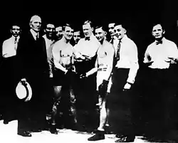 By 1923, during Prohibition, Long Hill was attracting more guests for its supply of home-brewed ciders and beers than its sporting facilities.[143] While in 1924, through their mutual acquaintance of Ring Lardner, F. Scott Fitzgerald turned up at the farm and sparred three rounds with Welsh.[144] In 1924, Welsh was back in court, after he was involved in a car collision caused by him driving his vehicle on the wrong side of the road.[145] Welsh began looking for other ventures to take him away from the health farm, and in 1925 he rejoined the US Army, becoming a boxing instructor at the Plattsburg Barracks in upstate New York. While in the forces he placed an advertisement for a manager to run Long Hill, which was accepted by neighbour and friend, Sidky Bey, and his wife Hranoush, known as Madame Bey.[146][147] With strict curfew hours and a no-alcohol policy, Madame Bey made the farm a success, and Long Hill became an important training venue for New York boxers.[146] But her tenure at the farm ended acrimoniously, over an argument with boxer Battling Siki, who Welsh believed to be a bad influence.[148] After discussing the matter with other boxers, Madame Bey left Long Hill and set up her own rival venue.[148] With Welsh in the Army and Madame Bey gone, the farm fell into disrepair. Bey later recalled Welsh fondly, stating that he was a man who enjoyed having a good time, but was a terrible businessman.[148]