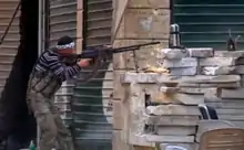 By 26 January, the Damascus suburb of Douma had fallen under control of the Free Syrian Army, with occasional raids by security forces failing to dislodge the rebels, mainly made of armed civilians, and some army defectors, mostly armed with assault rifles and hand grenades.[170] Because of the growing number of defectors, some defectors managed to take their tanks with them. A spokesman for the Free Syrian Army said that more than 100 soldiers defected on 28 January 2012, bringing three tanks along with them.[171] By the end of January and the beginning of February, videos surfaced showing BMP-2 armoured personnel carriers in Homs carrying the Syrian independence flag firing at government forces, supported by FSA soldiers.[172]