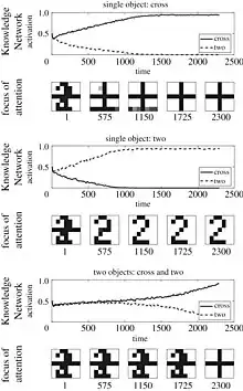 Simulation of the results achieved from a selective attention task carried out by the Bayesian reformulation of the SAIM entitled PE-SAIM in multiple objects environment. The graphs show the time course of the activation for the FOA and the two template units in the Knowledge Network.