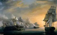 Formidable was the flagship of Rear-Admiral Pierre Dumanoir le Pelley, who commanded the six-ship vanguard of the French fleet, along with Formidable, Scipion, Duguay-Trouin, Mont Blanc, Intrépide and Neptune. The vanguard was kept as a reserve, and joined the battle around 16:00. They only sailed close to the battle and fired a few shots.