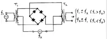 Schematic diagram of a double-balanced passive diode mixer (also known as a ring modulator). There is no output unless both f1 and f2 inputs are present, though f2 (but not f1) can be DC.