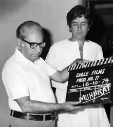 Sippy holding a clapperboard with Shashi Kapoor at the sets of a film in 1974