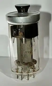 The GU-50 (Russian: ГУ-50) is a power pentode vacuum tube intended for 50 watt operation as a linear RF amplifier on frequencies up to 120 MHz. It is, in fact, a Soviet-produced copy of the Telefunken LS-50 power pentode,[1] possibly reverse-engineered from German (Wehrmacht) military radios captured during World War II, or based on documentation, machines and materials captured as a trophy. It is one of the more unusual types of tube because of its non-standard 8-pin base and a metal "cap" (not connected to any of the tube internal elements) with a plastic "handle" on top of the envelope - which is meant to ease extracting the tube from its socket (especially when the tube is hot). One stock Russian-produced socket includes a rugged die-cast metal cage-like enclosure for the tube with spring-loaded locking lid. (The cap was made for fixation of the tube in the metal can, since tubes were designed for mobile operations). Another stock Russian-produced socket is stamped of light aluminium sheet metal, without a lid on top.[2]