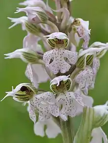 A galea is an overhanging, helmet-shaped, part of the flower[1][2] that protects the reproductive parts from precipitation, wind, or unwanted visitors. The galea is composed of one or more petals or sepals that have either fused or folded together. The name is taken from the same word for a Roman soldier's helmet. [3]