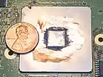 IBM PowerPC "Gekko" processor (180 nm) shaven down to show the silicon die