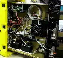 This image above shows the interior of a GeoStrata Technologies Eclipse Gas Chromatograph that runs continuously in three-minute cycles. Two valves are used to switch the test gas into the sample loop. After filling the sample loop with test gas, the valves are switched again applying carrier gas pressure to the sample loop and forcing the sample through the column for separation.