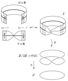 Non-trivial Z/2Z principal bundle over the circle. There is no obvious way to identify which point corresponds to +1 or -1 in each fibre. This bundle is non-trivial as there is no globally defined section of the projection π.