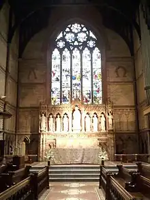 In 1878, Eugene Augustus Hoffman – said to be the richest clergyman in the world due to his extensive real estate holdings[18] – was appointed dean. Under his tenure, the seminary saw tremendous growth, both in student body and facilities. Dean Hoffman's "grand design" was for the seminary's Chelsea campus to be built on an Oxford model, with neo-Gothic buildings facing onto a central quadrangle or Close. Likely Dean Hoffman's most influential addition to the seminary's campus was the Chapel of the Good Shepherd which was begun in 1886, completed two years later, and became known as the "Jewel of Chelsea Square." Its set of 15 tubular bells is the oldest extant in this country, with tubes by John Harrington of Coventry, England; original installation (1888) by Walter Durfee of Providence, Rhode Island; and a modern baton clavier (1983) by Royal Eijsbouts of Asten, Netherlands.[19] The tower chime is played daily by members of the seminary's Guild of Chimers to call the community to worship. Architect Charles C. Haight designed and supervised construction of most of the buildings on Chelsea Square while Haight's father, Benjamin I. Haight, was the first priest at nearby St. Peter's Episcopal Church.