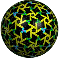An artistic model created by Father Magnus Wenninger called Order in Chaos, representing a chiral subset of triangles of a 16-frequency icosahedral geodesic sphere, {3,5+}16,0
