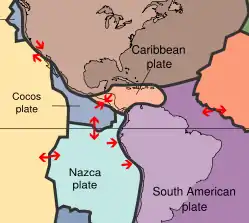 Tectonic movement of the cordilleras continues today, as evidenced by frequent seismic activity.[1] Indeed, Colombia remains part of the Pacific Ring of Fire, an active seismic area that surrounds the Pacific basin.[1] The country is located where three lithospheric plates—Nazca, Caribbean, and South American—converge, and their movement produces different types of geologic faults.[1] Almost all of the country's many earthquakes in recent centuries have occurred in the mountainous and coastal regions.[1] Recent major earthquakes include those in Popayán on March 31, 1983, and in the nation's coffee-growing belt on January 25, 1999; and one on March 6, 1987, on the border with Ecuador, measuring 7.0 on the Richter magnitude scale.[1] Recent earthquakes that struck Colombia's Pacific coast areas have included one accompanied by a tsunami in Tumaco, Nariño Department, on December 12, 1979, measuring 7.9 on the Richter magnitude scale, the largest in northwestern South America since 1942; another on November 15, 2004, with a magnitude of 6.7; and one on September 10, 2007, measuring 6.8.[1] Although construction standards are high for new buildings in the main cities, smaller cities and rural zones are particularly vulnerable to earthquakes.[1]