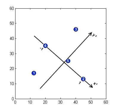 - Find the model's feature points. Assume that 5 feature points are found in the model image with the coordinates , see the picture.