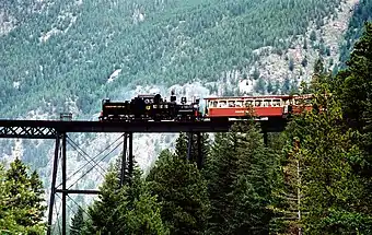 This tourist train runs between the communities of Georgetown and Silver Plume, a distance of 2 miles (3.2 km). The route is 4.5 miles (7.2 km) long and ascends an elevation of 640 feet (195.1 m) through mountainous terrain along with trestles, cuts, fills, and a grand loop.[3][4]