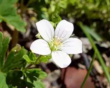 The flowers are a white to pale pink. The stalks that grow up to 7cm[9] contain a singular flower, consisting of five green sepals and five white to pale pink petals with translucent veins.[10] The petals are 5-6mm long and the tips may be notched or rounded. Each plant has both male and female organs and is usually pollinated by insects.[6] Geranium potentilloides flower from around October to April in its native habitat.[7][9]