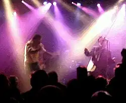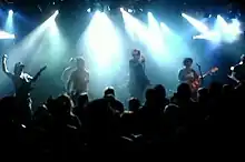 They have played headlining gigs in small indie venues as well as supporting big acts such as R.E.M.[11] and Siouxsie and the Banshees on major international tours, frontman Gerard Langley always wearing his trademark shades even at night in dark venues.[12] Performances include the band's 1992 appearance at Glastonbury which was broadcast on BBC Radio 1,[13] the finale at the Hammersmith Apollo when 12 guitarists were seen on stage performing "Breaking in My Heart" and their annual appearance at Fiddlers in Bristol[14] which has now been relocated to the band's own venue, The Fleece.[15]