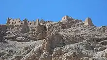 The mountain top has its own fortifications. There is a citadel 30.5 metres (100 ft) in length and 24 metres (79 ft) in width. Its base is built with dressed blocks of stone and features a well in the middle. The main inhabited area, which is visible from the plain, was a complex of two rows of buildings on the south-eastern slope, all of them at least two or three stories high. On the north-east, there is a late mud wall with little remnants of buildings. On the south-west there is a cistern and remains of a defensive tower. The main water catchment area is, however, the three cisterns on the southern side of the hilltop where the ground drops steeply about 60.5 metres (198 ft). They feature an outer wall of 3 metres (9.8 ft) in thickness made of stone and mud-brick covered by plaster, with vaulted roofs and turrets. There are more cisterns and wells elsewhere within the fortifications.[5]