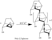 Poly(2-3)-D-glucose was synthesized proceeds by transformation of benzyl (R= -CH2C6H5) functionalized polymer.[6]