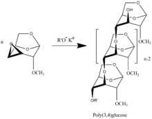 Polymerization of 3,4-epoxy levoglucosan (1,6;3,4-dianhydro-2-O-alkyl-β-D-galactopyranose) results in formation 3,4-bounded levoglucosan polymer.[9]