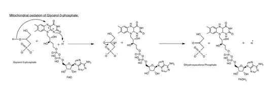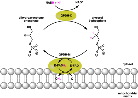 The cytosolic together with the mitochondrial glycerol-3-phosphate dehydrogenase work in concert. Oxidation of cytoplasmic NADH by the cytosolic form of the enzyme creates glycerol-3-phosphate from dihydroxyacetone phosphate. Once the glycerol-3-phosphate has moved through the outer mitochondrial membrane it can then be oxidised by a separate isoform of glycerol-3-phosphate dehydrogenase that uses quinone as an oxidant and FAD as a co-factor. As a result, there is a net loss in energy, comparable to one molecule of ATP.[7]