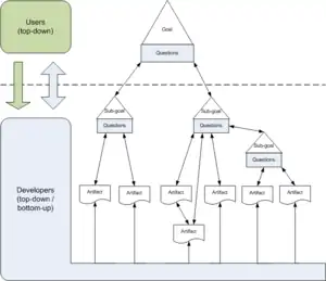 While the top-down orientation supports a horizontal team organization, bottom-up approaches try to provide generalized components or services, leading to a better user satisfaction.[4] The collaborative identification of goals introduced by GDP allows combining top-down with bottom-up aspects (“top-down thinking and bottom-up acting” [1]) to support artifacts consistency and allowing vertical team organization.