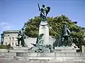 John received a further number of national and international commissions, including several for war memorials. John's 1905 King's Regiment Boer War memorial in St John's Gardens, Liverpool depicts two soldiers of the regiment from different historical periods, one from the 17th century and one from the Boer War period, around a figure of Britannia on a pedestal.[2] John created a similar representation of a regiment's heroic traditions for the 1924 Royal Welch Fusiliers memorial at Wrexham which features statues of 18th and 20th century soldiers.[2] On the reverse of the Liverpool monument is a sculpture featuring a regimental drummer boy of 1743. This was subsequently cast as a separate, small bronze in an edition for the retail market and became a popular purchase while a monumental version was also cast and is held by the National Museum Wales.[13]