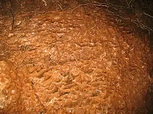 Rimstone, also called gours, is a type of speleothem (cave formation) in the form of a stone dam. Rimstone is made up of calcite and other minerals that build up in cave pools. The formation created, which looks like stairs, often extends into flowstone above or below the original rimstone. Often, rimstone is covered with small, micro-gours on horizontal surfaces. Rimstone basins may form terraces that extend over hundreds of feet, with single basins known up to 200 feet long from Tham Xe Biang Fai in Laos.[1]