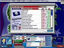 Some games in the genre involve enacting policies and budget decisions to sway voters. One such game is Democracy, published in 2005 by Positech Games. In Democracy, players make decisions during each turn regarding which policies to support. As turns progress, the player views how their favourability rating changes amongst certain types of voters.[16] Candidates make promises before each election, and failure to follow through can result in lower support during the player's re-election campaign.[17] Other examples are the Geo-Political-Simulator series, produced by Eversim, boasting an array of choices for domestic policy and decisions based around current geopolitical issues,[18] and Tropico series.