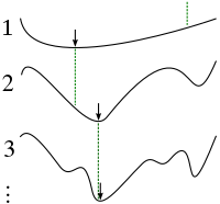 Graduated optimization is an improvement to hill climbing that enables a hill climber to avoid settling into local optima.[4] It breaks a difficult optimization problem into a sequence of optimization problems, such that the first problem in the sequence is convex (or nearly convex), the solution to each problem gives a good starting point to the next problem in the sequence, and the last problem in the sequence is the difficult optimization problem that it ultimately seeks to solve. Often, graduated optimization gives better results than simple hill climbing. Further, when certain conditions exist, it can be shown to find an optimal solution to the final problem in the sequence. These conditions are: