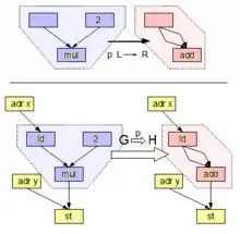 Formally, a graph rewriting system usually consists of a set of graph rewrite rules of the form , with being called pattern graph (or left-hand side) and being called replacement graph (or right-hand side of the rule). A graph rewrite rule is applied to the host graph by searching for an occurrence of the pattern graph (pattern matching, thus solving the subgraph isomorphism problem) and by replacing the found occurrence by an instance of the replacement graph. Rewrite rules can be further regulated in the case of labeled graphs, such as in string-regulated graph grammars.