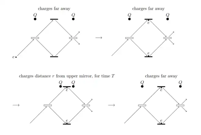 In the above figure, the beamsplitter puts the electron in a superposition of taking the upper path and taking the lower path. In both paths, when the electron gets to the mirror, it is stopped and held there. During that time when the electron is held in place at a mirror, 2 electric charges each with charge are brought near the upper mirror in a symmetric manner such that the net electric field caused by the 2 charges at the upper mirror is 0. We assume that the lower mirror is far enough away from the upper mirror such that the electric potential (and electric field) caused by the 2 charges is 0 at the lower mirror. So, this creates an electric potential difference between upper and lower mirrors equal to , where is the distance of the charges from the mirror and is the electric constant. The electron is held there for a time , after which the charges are moved away and the electron is allowed to continue moving along its path. Assuming that the time we take to move the 2 charges to and from the mirror is much smaller than , this time that the electron spends at the mirror causes a phase shift equal to