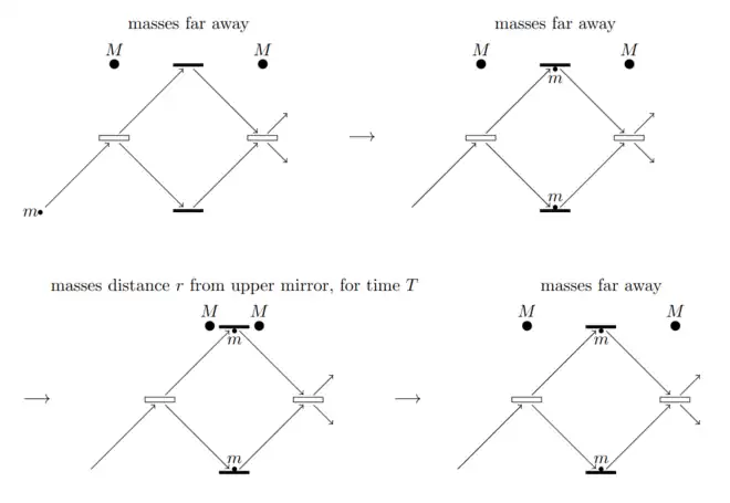 When the atom is at a "mirror", it is paused and held there while a potential is introduced. The potential is created by moving 2 massive objects, each with mass , to the left and right sides of the upper mirror, a distance away from the mirror. The masses are brought towards the upper mirror in a symmetric manner such that the gravitational field caused by the masses is 0 at the upper mirror. We assume that the upper mirror is far enough away from the lower mirror such that the masses create zero potential (and zero field) at the lower mirror, which means they create a gravitational potential difference of between the upper and lower mirrors. Despite this gravitational potential difference, the gravitational field at the upper and lower mirrors is 0, and the atom is never in any position with a nonzero gravitation field. Still, a time spent at the mirrors with that potential difference causes a phase shift,