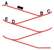 The term "switchback gravity railroad" is sometimes applied to gravity railroads that used special self-acting (momentum-driven) Y-shaped switches known as switchbacks to automatically reverse a car's direction at certain points as it descends; this essentially folds the incline across the slope in a characteristic "zig-zag" shape. (See diagram: car starts from point A, coasts through switch at B, and comes to a stop at C. Car then rolls through the switch again and proceeds to the switch at D, where the process is repeated.) A separate track was typically used to haul the empty cars back to the top.