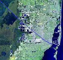 In its original natural state, the river started at rapids formed by water from the Everglades flowing over a rocky ledge four miles (6.4 km) from its mouth. Frederick H. Gerdes of the United States Coast Survey reported in 1849 that "[f]rom the upper falls to near its entrance into Key Biscayne Bay… water in the Glades was 6 feet 2.5 inches (1.892 m) above low tide."[5] The rapids were removed when the Miami Canal was dredged in an attempt to drain the wetland.[6]