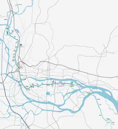 Line 8 of the Guangzhou Metro is a north-west L-shaped line on the system that runs from Jiaoxin to Wanshengwei, spanning a total of 33.9 km (21.06 mi)[4][5] with 28 stations. It interchanges with Line 1 at Chen Clan Academy, Line 2 at Changgang, Line 3 at Kecun, Line 4 at Wanshengwei and Line 6 at Cultural Park. All stations on Line 8 are underground.[6] Line 8's color is teal.