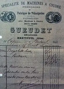 Born on 23 February 1852 in Troussencourt, France, and deceased in 1928. In 1880, he founded the Gueudet company as a bicycle and sewing machine maker. The business was then also known as Gueudet-Huré, Huré being the maiden name of Charles's wife, Marie. The bicycles were manufactured and sold under the brand "La Gauloise" whereas the sewing machines were manufactured and sold under the brand "Gueudet".