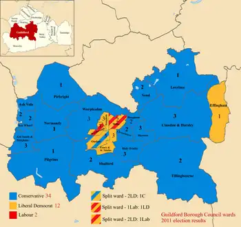 Wards electing councillors of more than one party – Friary and St Nicolas (3 – 2 Con, 1 Lib); Holy Trinity (2 – 1 Con, 1 Lib); Tillingbourne (2 – 1 Con, 1 Ind)