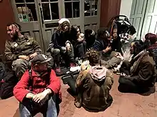 A gutter punk is a homeless or transient individual who displays a variety of specific lifestyle traits and characteristics that often, but not always, are associated with the punk subculture.[1] Attributes may include unkempt dreadlocks, nose rings, Mohawk hairstyles, and tattooed faces.[2] Gutter punks are sometimes referred to as "crusties", "crusty punks", "crust punks", or “crusty kids”; "traveling" or "traveler kids"; "traveling" or "traveler punks", or simply "travelers"; and "punk hobos" or "hobo-punks", among other terms. Some self-identified gutter punks may distinguish themselves from "crusties" or "crust punks" and "travellers", and vice versa; however, there is considerable overlap between the groups, and the terms are often used interchangeably.[3][4][5][6]