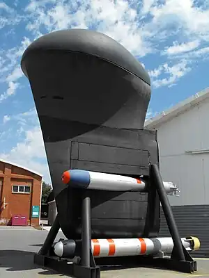 The main armament of the Oberons consisted of six 21-inch (533.4 mm) torpedo tubes.[1] The British Mark 8 torpedo was initially carried by the submarine; this was later replaced by the wire-guided Mark 23.[8] During the 1980s, the Australian Oberons were upgraded to carry United States Navy Mark 48 torpedoes and UGM-84 Sub Harpoon anti-ship missiles.[5] As of 1996, the standard payload of an Australian Oberon was a mix of 20 Mark 48 Mod 4 torpedoes and Sub Harpoon missiles.[6] Some or all of the torpedo payload could be replaced by Mark 5 Stonefish sea mines, which were deployed through the torpedo tubes.[8] On entering service, two stern-mounted, short-length 21-inch (53 cm) torpedo tubes for Mark 20 anti-submarine torpedoes.[9] However, the development of steerable wire-guided torpedoes made the less-capable aft-firing torpedoes redundant; they were closed off, and later removed during a refit.[9]