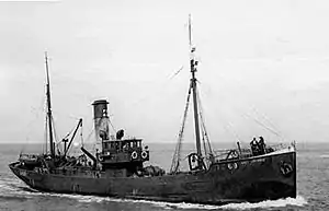 After the war, she stayed briefly in Grimsby, before being sold in February 1946 to Don Trawling Co (Milford) Ltd in Milford Haven. On 20 April 1946 she was in the fishing grounds off the west coast of Ireland during an 85 miles per hour (137 km/h) gale. The gale shifted 140 short tons (130 t) of coal in her bunker, forcing the ship onto her beam ends – so that the deck was near-vertical. The crew spent five and a half hours moving the coal by hand to restore her to an even keel and were eventually forced to put into Berehaven, County Cork.[3][5]