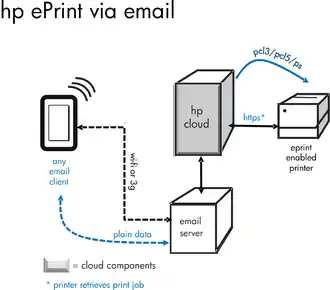 HP ePrint via Email is a feature that most HP printers and MFPs use. HP ePrint enables printing documents attached to email messages sent to the device. The HP ePrint-capable printer or MFP must be registered to an HP ePrint cloud service called HP ePrint Center, which assigns a unique email address to the printer or MFP. The assigned email address is customizable but by default is arbitrarily set to promote security since only those who know the email address can use it to print. HP ePrint via Email does not require a print driver installed on the client. The HP ePrint public cloud renders the printing data from each separate attachment into a suitable print data stream, such as PCL3, PCL 5, or PostScript, and, subsequently, sends it to the HP ePrint enabled printer. For this to work, the attachments for printing must be in a native plain format, such as any of the following: