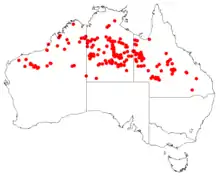 Hakea chordophylla ranges across the interior of central and northern Australia, from western Queensland though to northern Western Australia, to south of Karratha. A widespread species growing in spinifex grassland, woodland and scrubland on stony or red-brown sandy soil sometimes in stony laterite.[3][8]