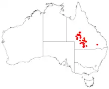 It is endemic to an area in the south west of Queensland on lateritic tableland on hills and plains as a part of open Acacia woodland and shrubland communities.[5]
