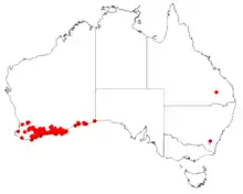 Frog hakea grows in southern Western Australia from Busselton to Eucla on sandy-loam, clay and gravel in mallee or heath.[9] An ornamental shrub, a good habitat plant for wildlife.[8]