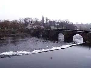 During the medieval period, multiple river crossings were built on the site of the bridge noted in the Domesday Book to replace others lost to flooding; the current Old Dee Bridge dates from 1353, but at least four other bridges existed on the site beforehand. The bridge became a choke point in Welsh invasions, leading to both ends of the bridge being fitted with sentry posts. Although the bridge formed the only crossing at that point, residents were reluctant to repair the bridge, leading Richard II of England to pay for the crossing to be restored in 1374 "for consideration that as many have been drowned in the water of the Dee since the bridge has been destroyed and broken", being rebuilt with large towers and a drawbridge to further deter Welsh raids.[1]
