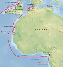 Greek historian Herodotus, writing around 430 BC, described Carthaginian trade on the Moroccan coast (Histories 4.196[30]), though it is doubtful whether he was aware of Hanno's voyage itself.[19]