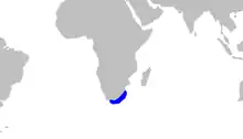 The brown shyshark has a restricted distribution along the coast of South Africa, from the Western and Eastern Cape Provinces to southern KwaZulu-Natal Province. It is usually found close to the bottom over sandy flats or rocky reefs, from the intertidal zone to a depth of 35 m (115 ft). However, it has been reported from as deep as 133 m (436 ft).[5][6] The range of this species overlaps with the puffadder shyshark in the southeastern Cape region. There, the brown shyshark tends to favor shallow inshore habitats, while the puffadder shyshark inhabits deeper offshore waters.[4]